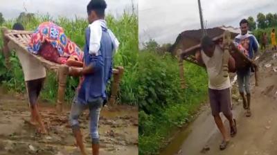 सड़क न होने से खटिया पर ले जाई गई प्रसव पीड़ित महिला