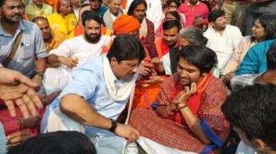 राजा भैया ने थामा बाबा बागेश्वर का हाथ, पदयात्रा में बेटों के साथ दिया साथ