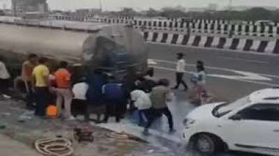 मेरठ एक्सप्रेस वे पर टैंकर-ट्रक की टक्कर पड़ी रही ड्राइवर की लाश और दूध लूटते रहे लोग